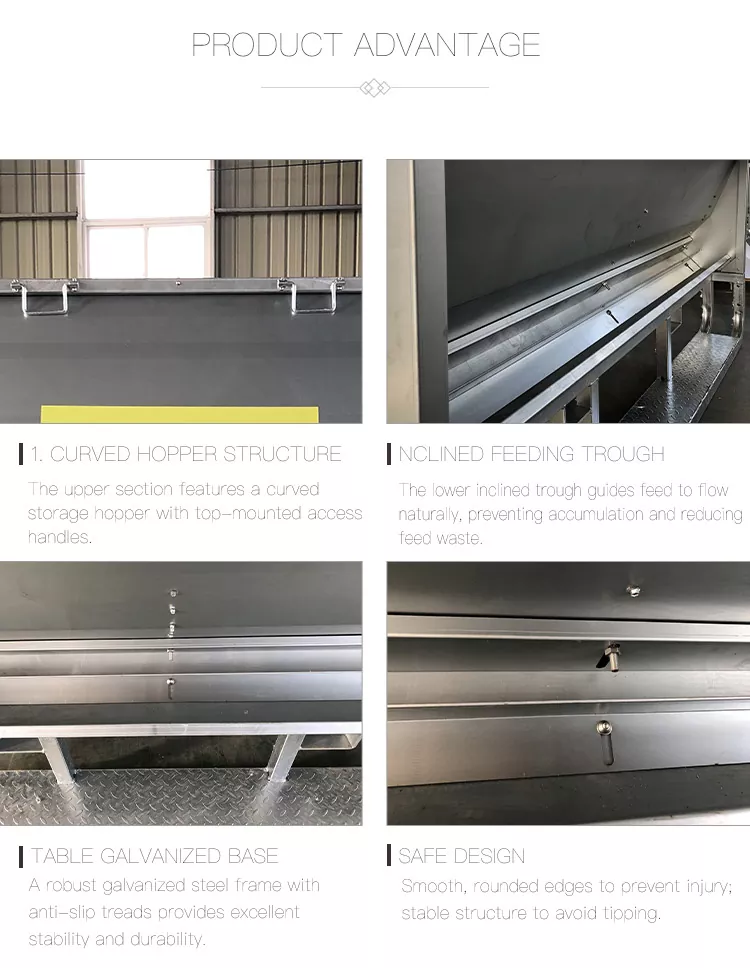 2. Hellende voerbak: De lagere, schuine voerbak zorgt ervoor dat het voer op natuurlijke wijze stroomt, waardoor ophoping wordt voorkomen en voerverspilling wordt verminderd.